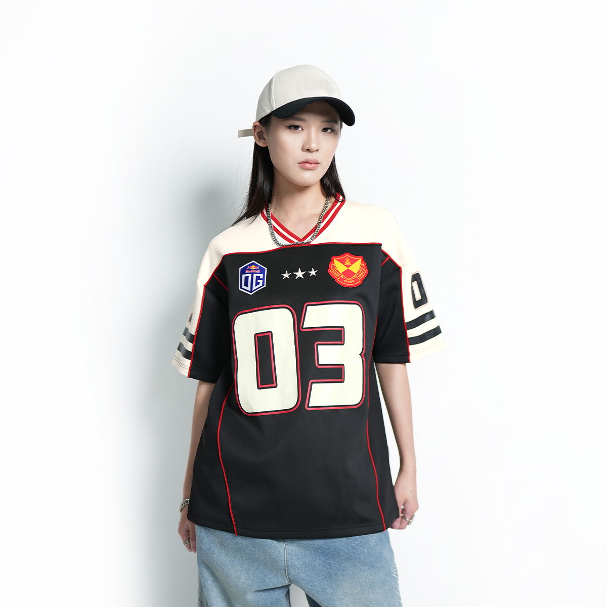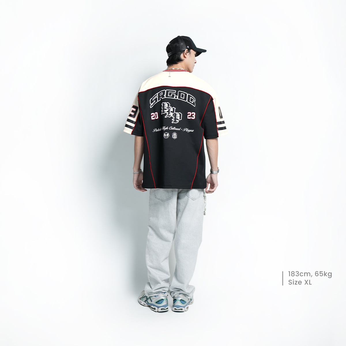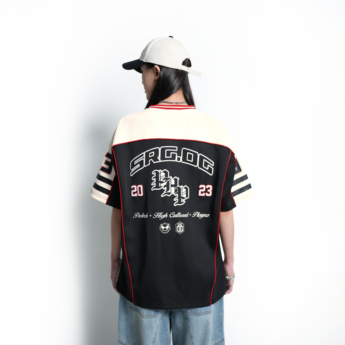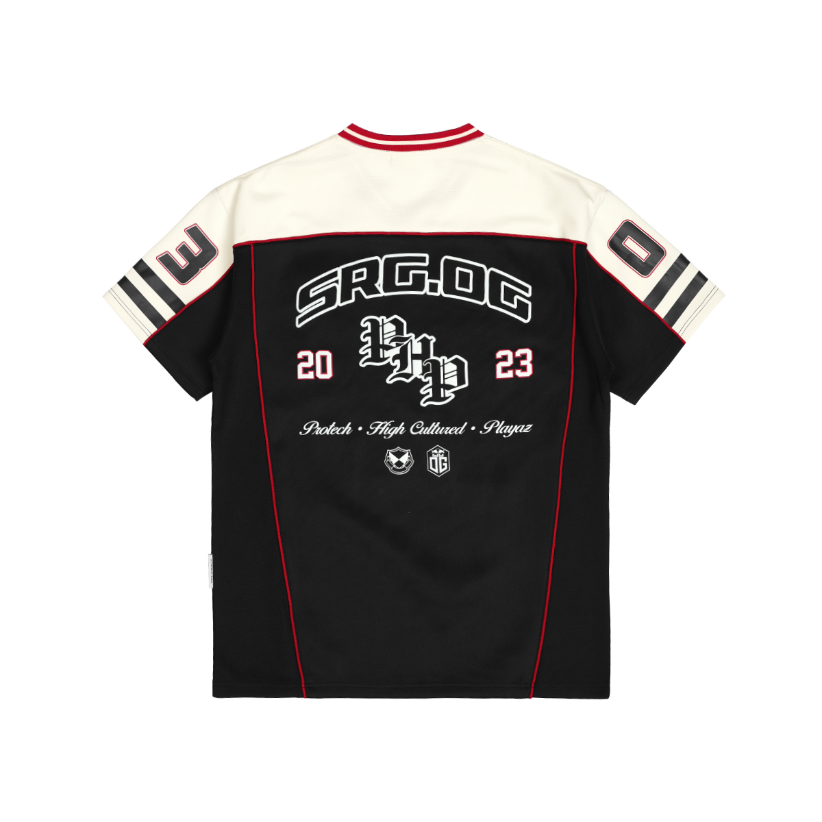 Esports fans with sharp eyes will instantly recognize the inspiration behind this SRG.OG jersey top. The chest features two logos and a bold SRG.OG print in the center, adding a touch of authenticity. Turn it around and you’ll see “PROTECH, HIGH CULTURED x PLAYAZ” printed across the back a striking tribute to the legendary sponsor and a stylish nod to longtime supporters.